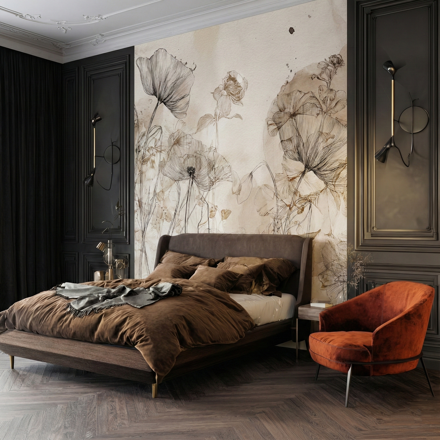 To nie jest zwykła dekoracja, to manifest artystyczny na Twojej ścianie. Duża skala kwiatów optycznie powiększa przestrzeń, a minimalistyczna paleta barw (beż, czerń, brąz) sprawia, że wzór pasuje zarówno do wnętrz w stylu Japandi, jak i nowoczesnych loftów. Tapeta stanowi wyraziste tło, które przyciąga wzrok, nie przytłaczając jednocześnie aranżacji.