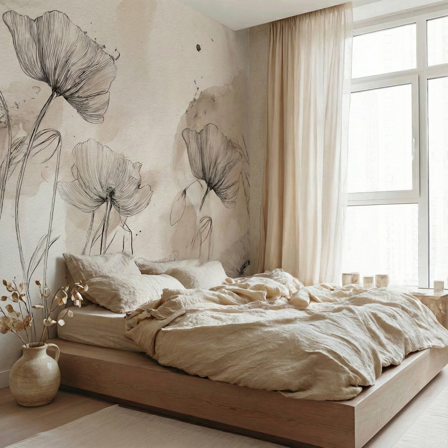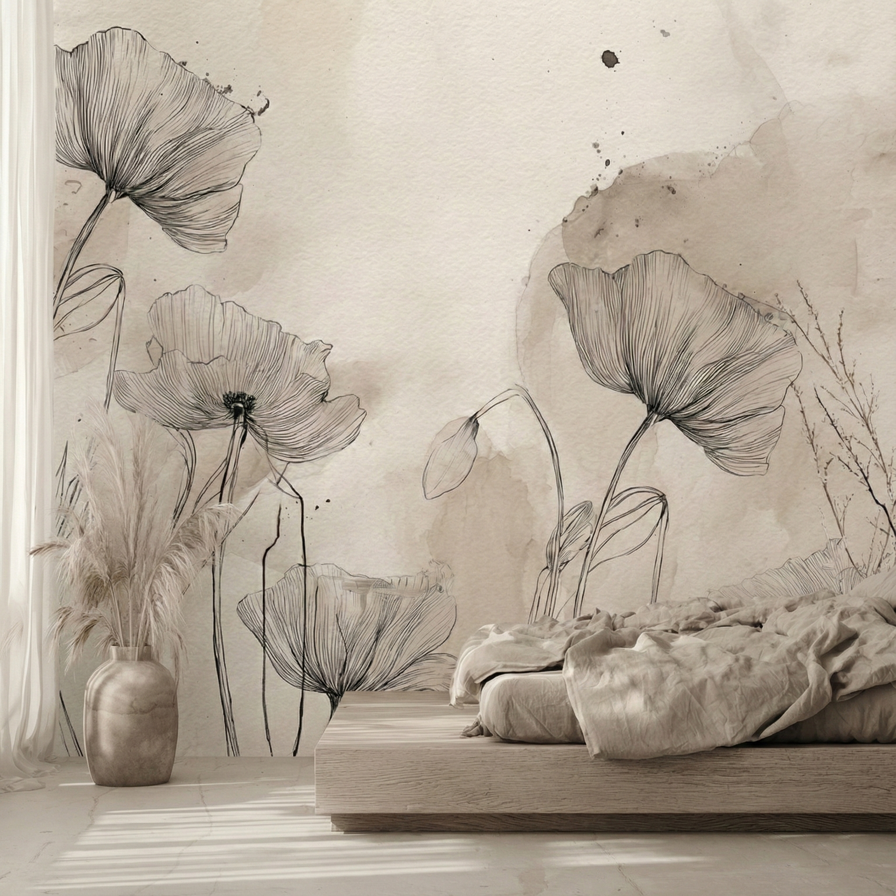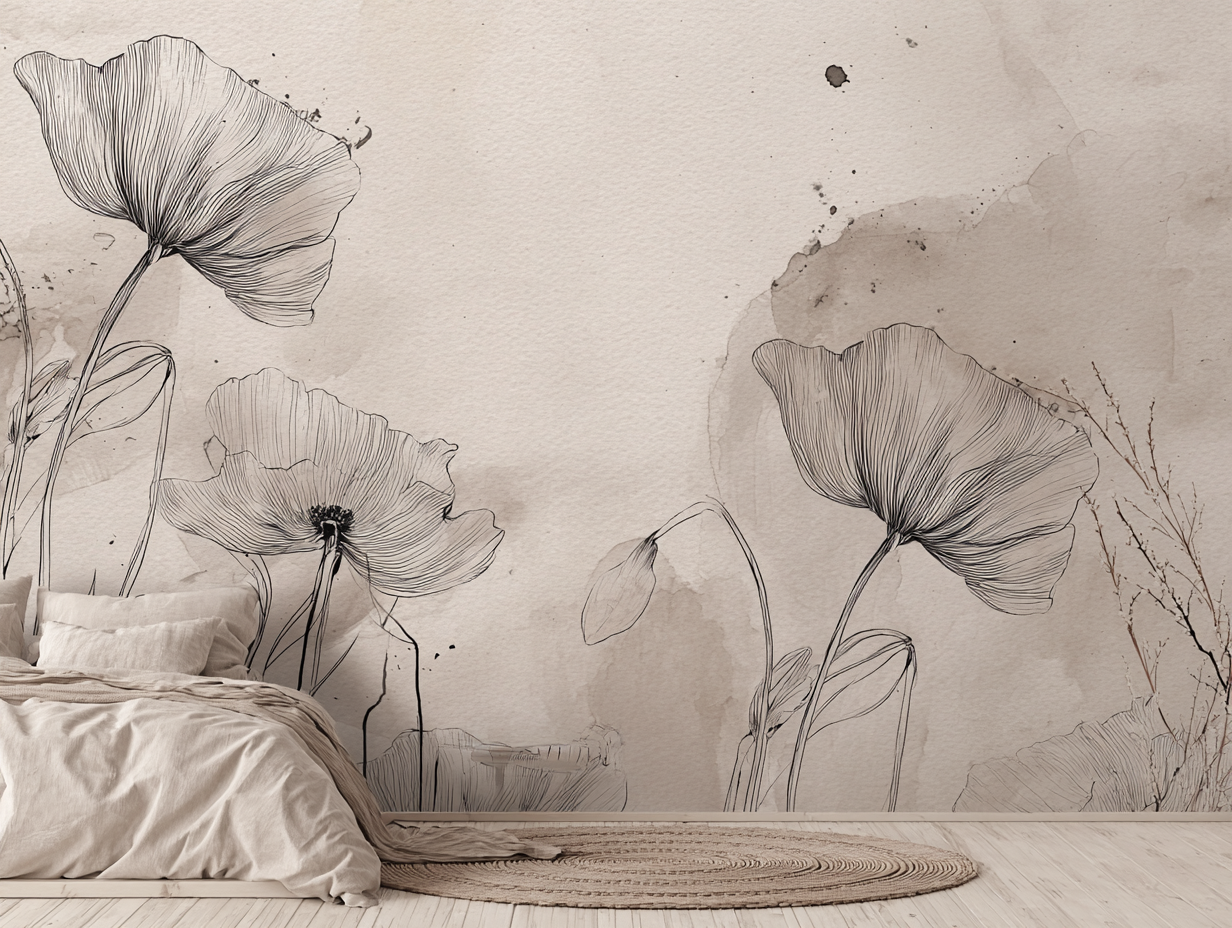 Wprowadź do swojego domu sztukę wielkiego formatu. Fototapeta artystyczne maki to połączenie precyzyjnego szkicu z subtelnością akwarelowych plam, tworzące kompozycję pełną lekkości i nowoczesnej elegancji.