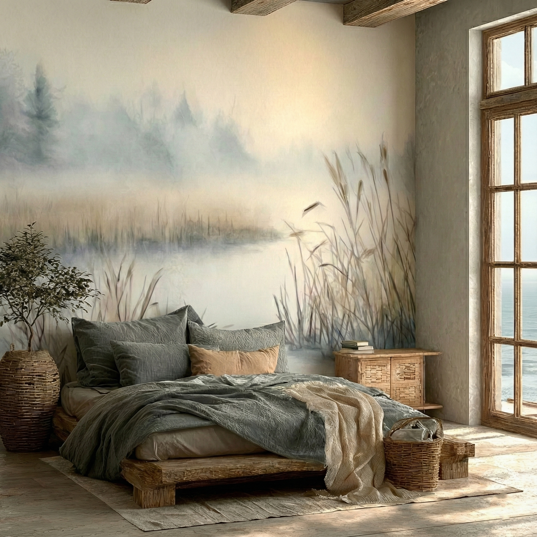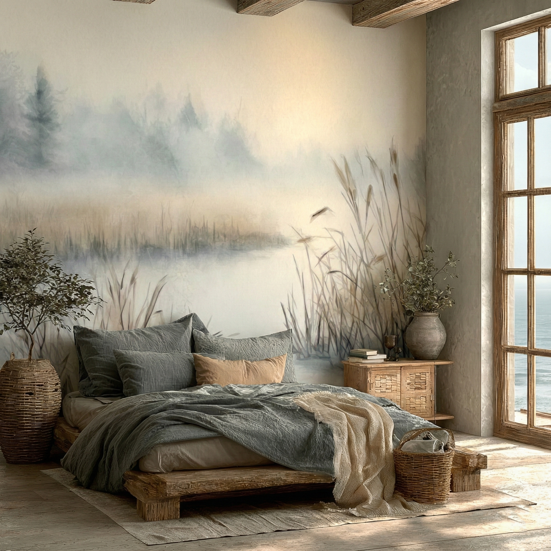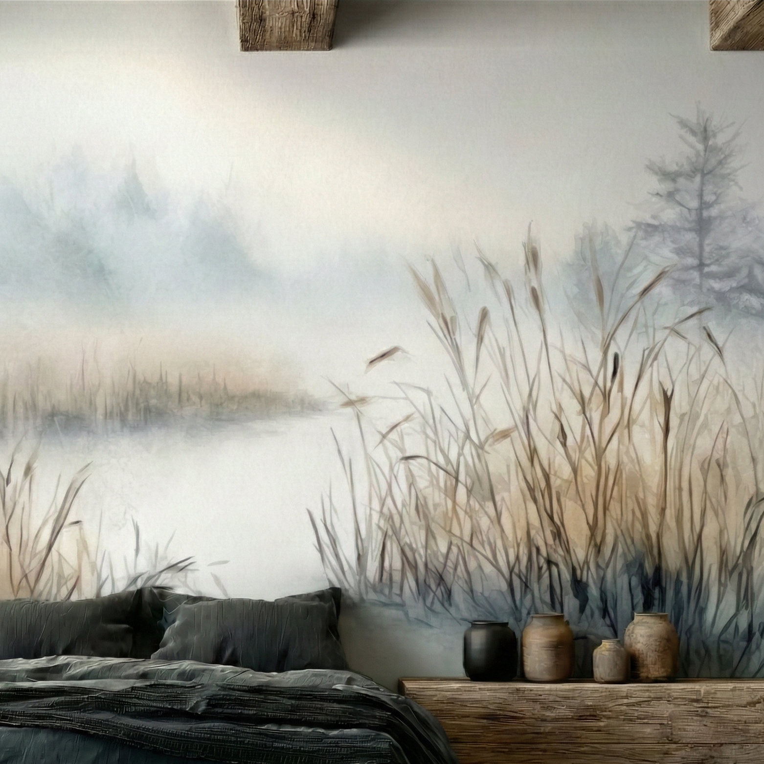 Ten wzór optycznie powiększa wnętrze dzięki perspektywie powietrznej. Stonowana kolorystyka (szarości, biel, wyblakły błękit) pasuje do surowego drewna i betonu.
