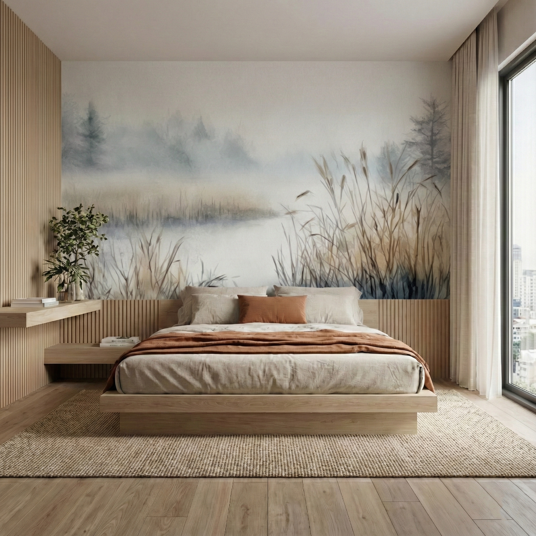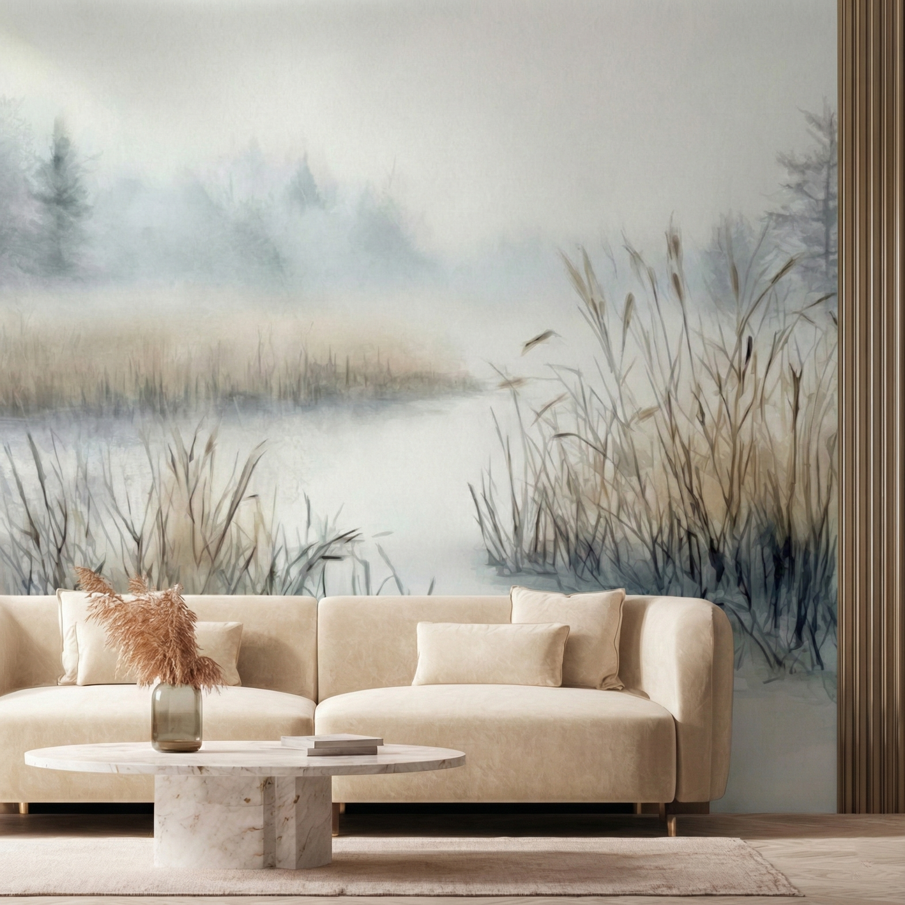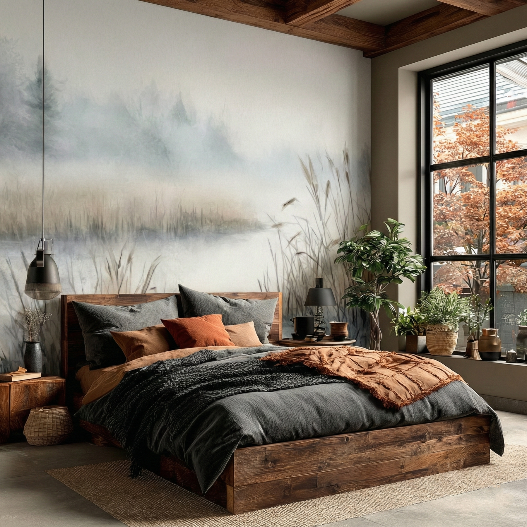 Ten wzór optycznie powiększa wnętrze dzięki perspektywie powietrznej. Stonowana kolorystyka (szarości, biel, wyblakły błękit) pasuje do surowego drewna i betonu.