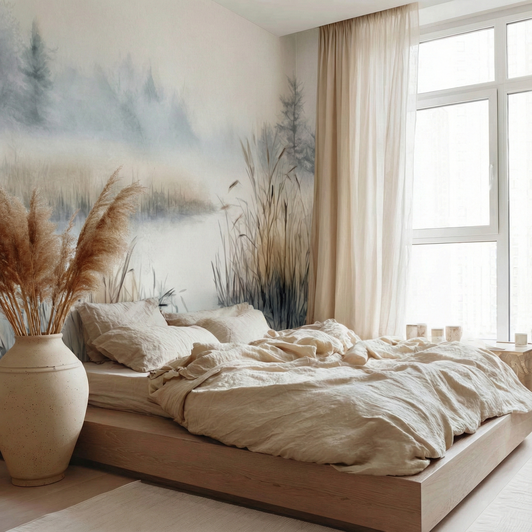 Fototapeta mglisty las w stylu akwareli to rozwiązanie do nowoczesnych sypialni i salonów skandynawskich. Produkt wykonany z grubego winylu strukturalnego imitującego płótno, co maskuje nierówności ściany i zapewnia matowe wykończenie.