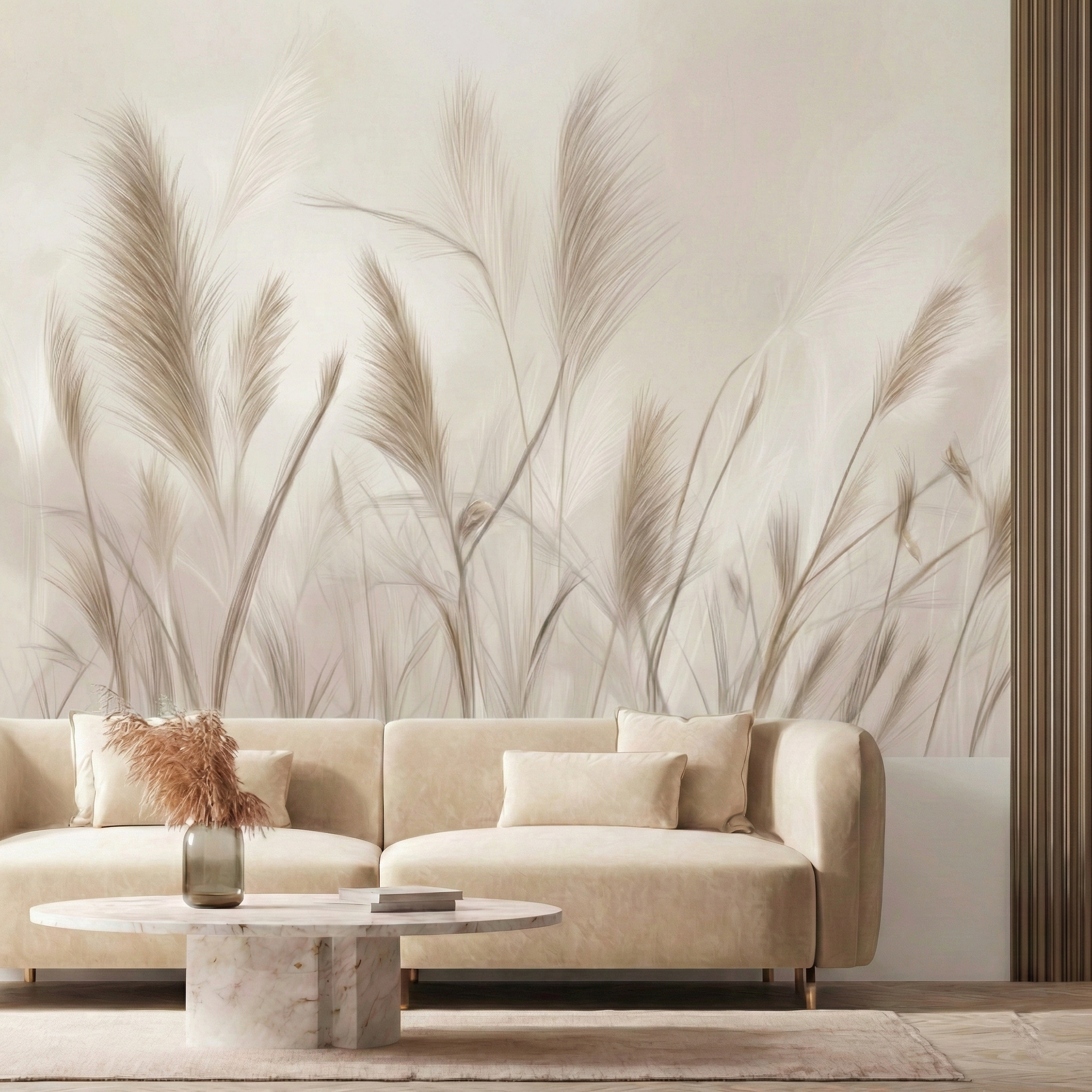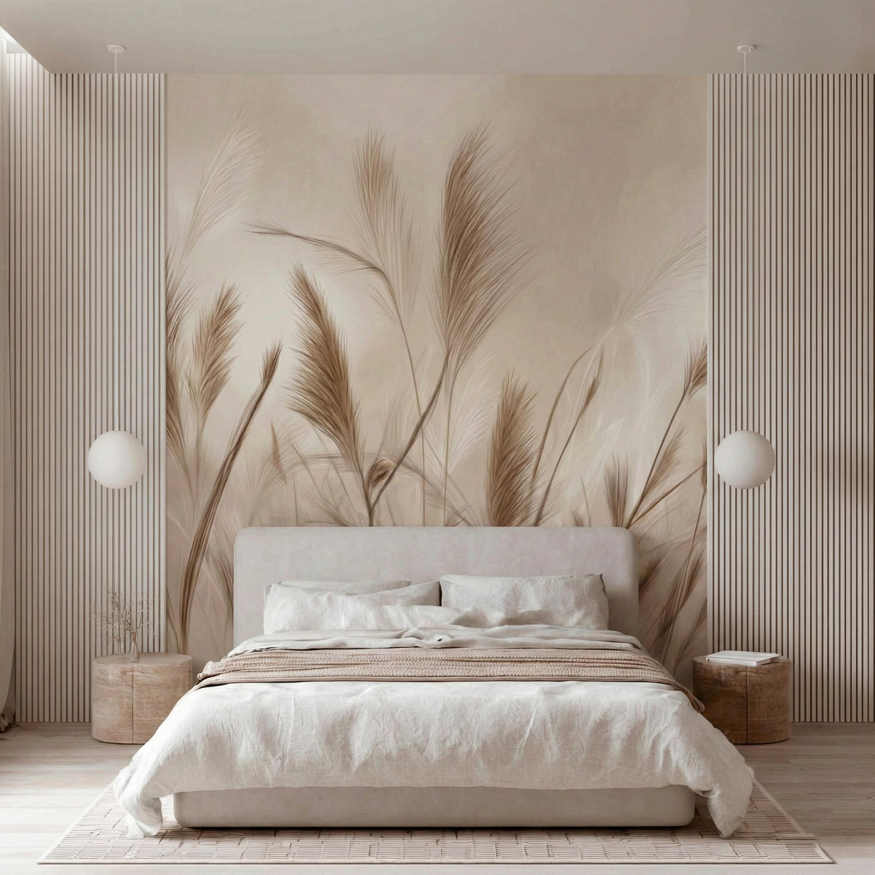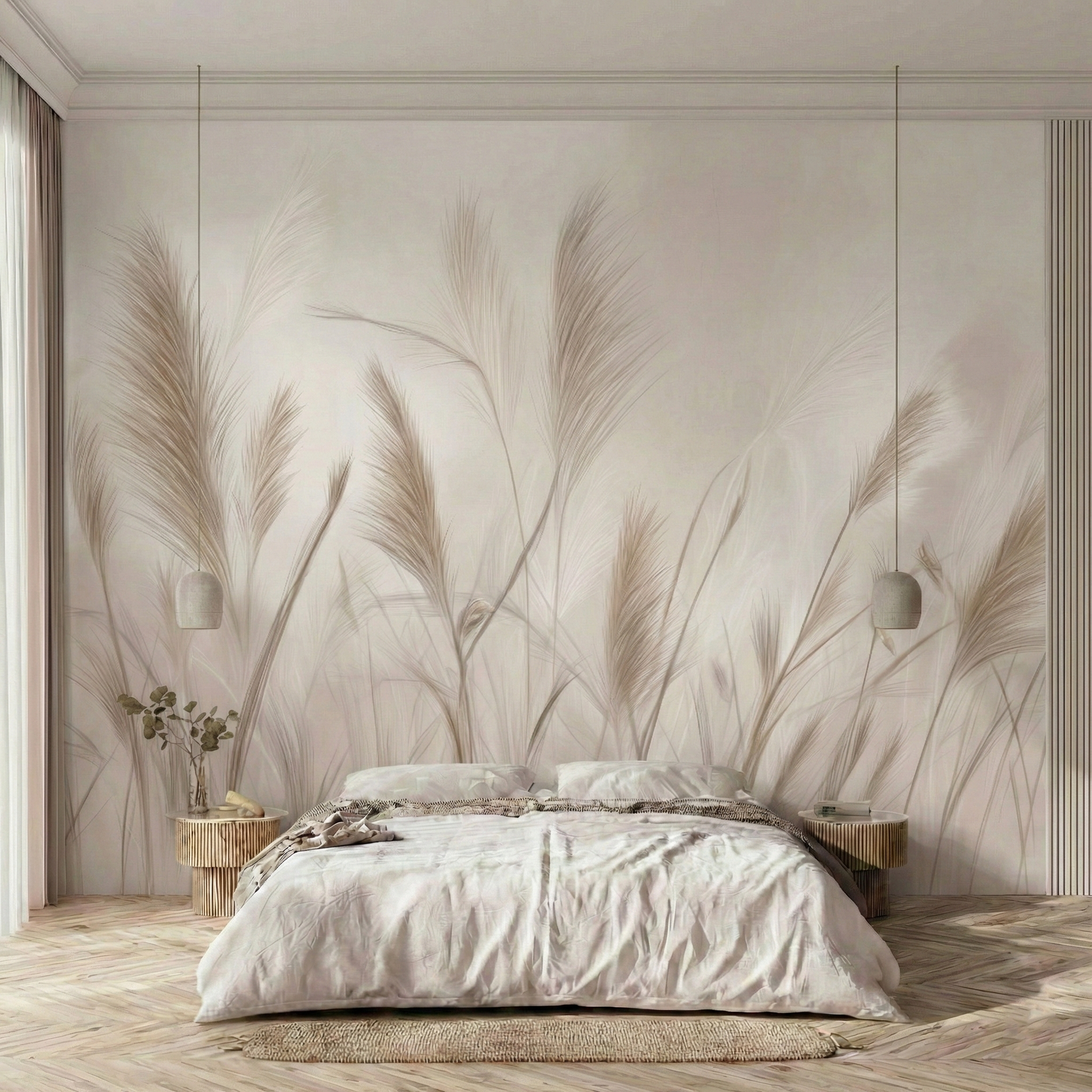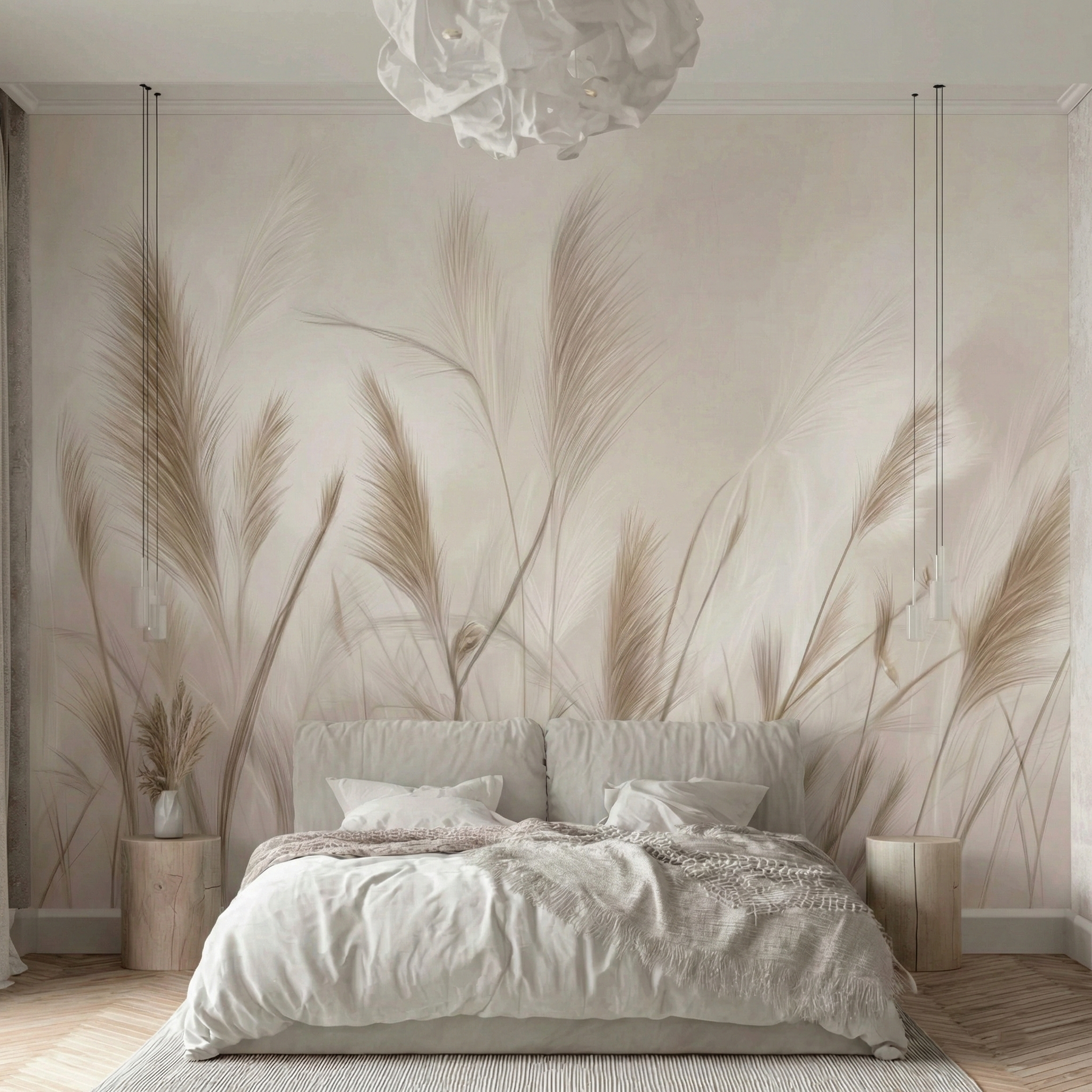 Zbliżenie na puszyste pióropusze traw w jasnych, kremowych odcieniach działa niezwykle kojąco na zmysły. Miękki focus i rozmyte tło dodają wnętrzu lekkości i romantycznego charakteru. To idealne rozwiązanie do sypialni w stylu glamour boho lub nowoczesnym, gdzie liczy się jasność, przestrzeń i harmonia.