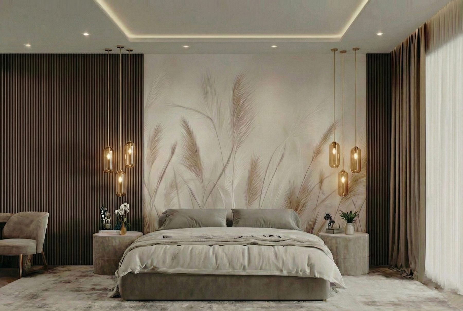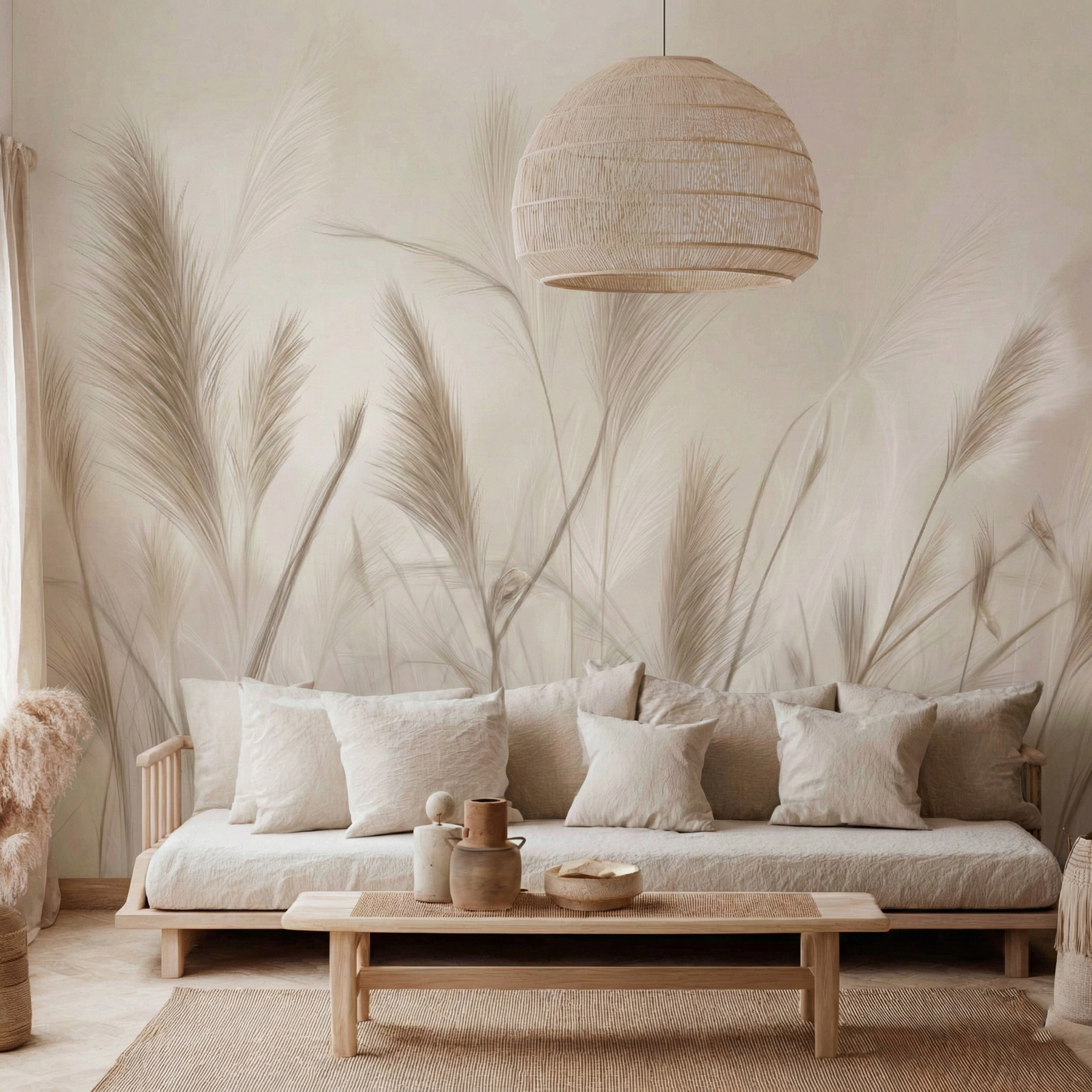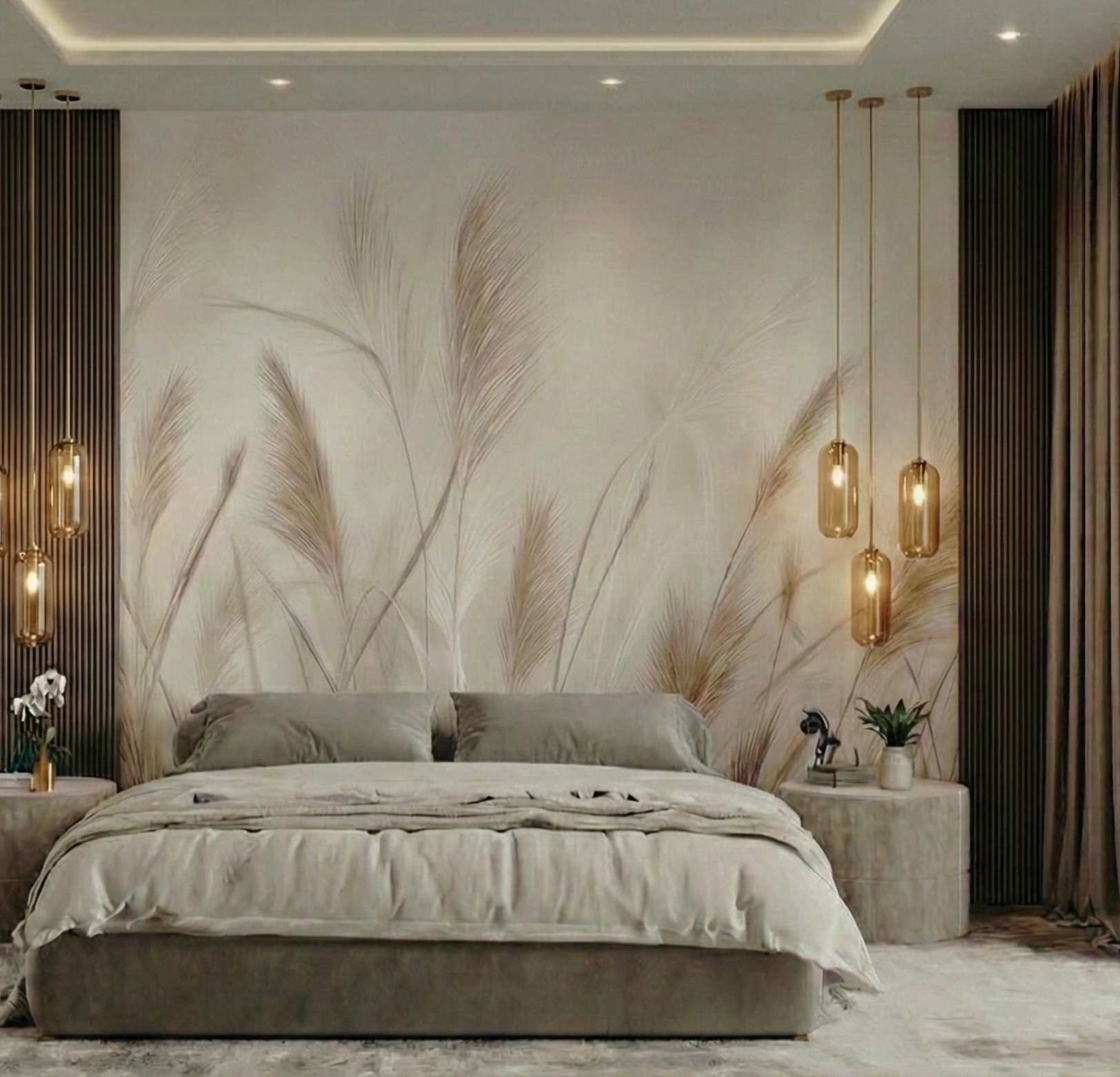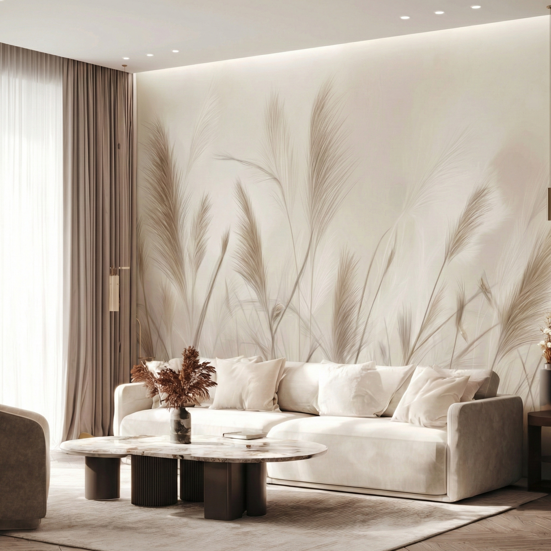 Zbliżenie na puszyste pióropusze traw w jasnych, kremowych odcieniach działa niezwykle kojąco na zmysły. Miękki focus i rozmyte tło dodają wnętrzu lekkości i romantycznego charakteru. To idealne rozwiązanie do sypialni w stylu glamour boho lub nowoczesnym, gdzie liczy się jasność, przestrzeń i harmonia.