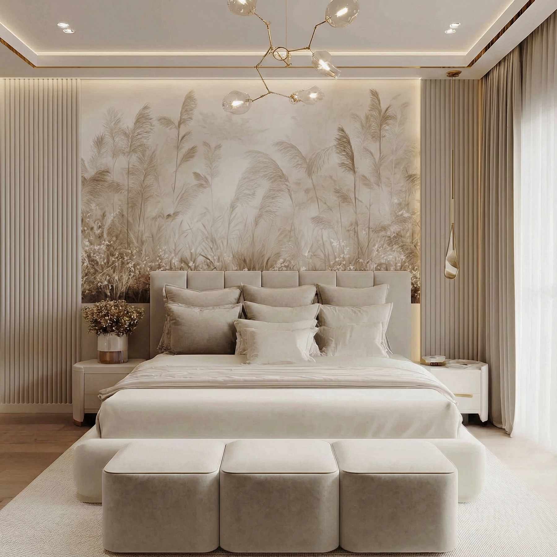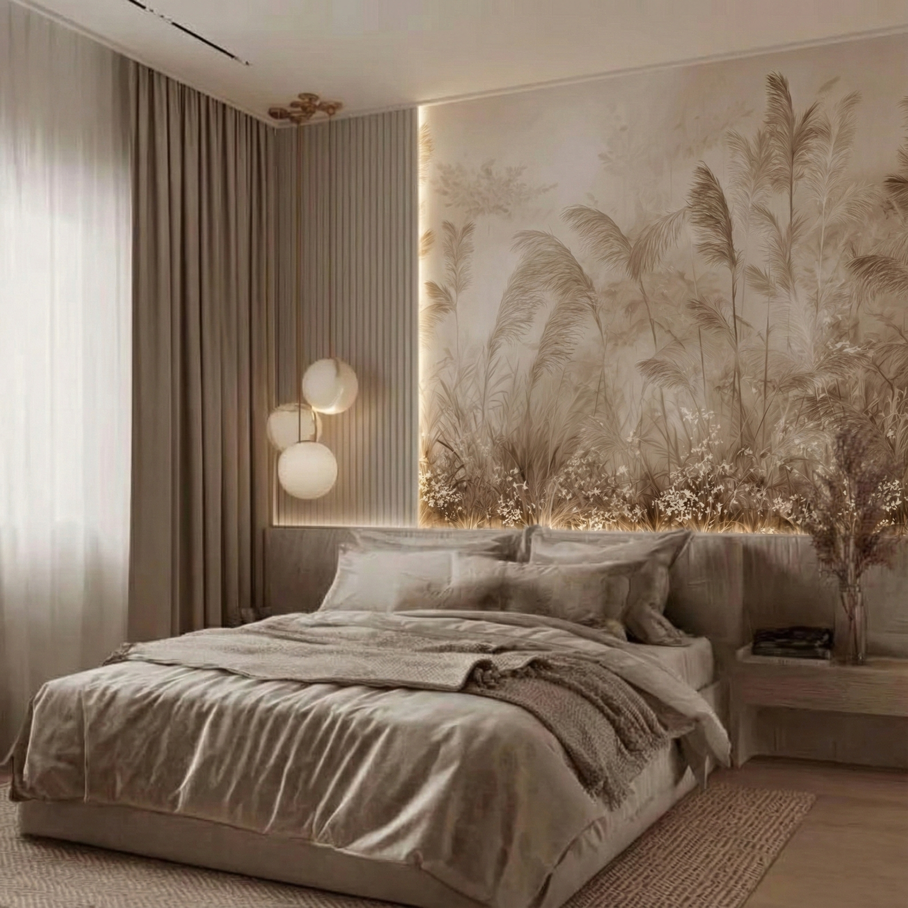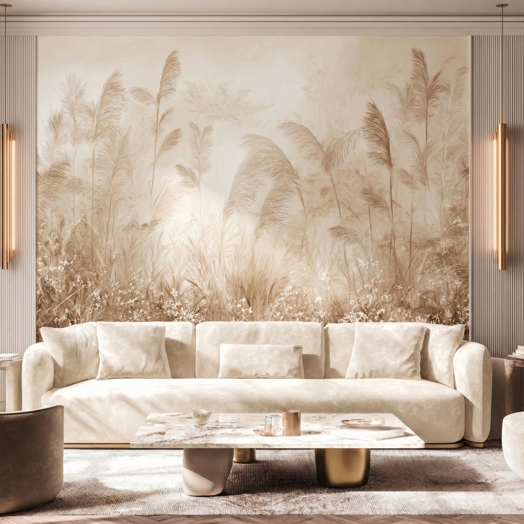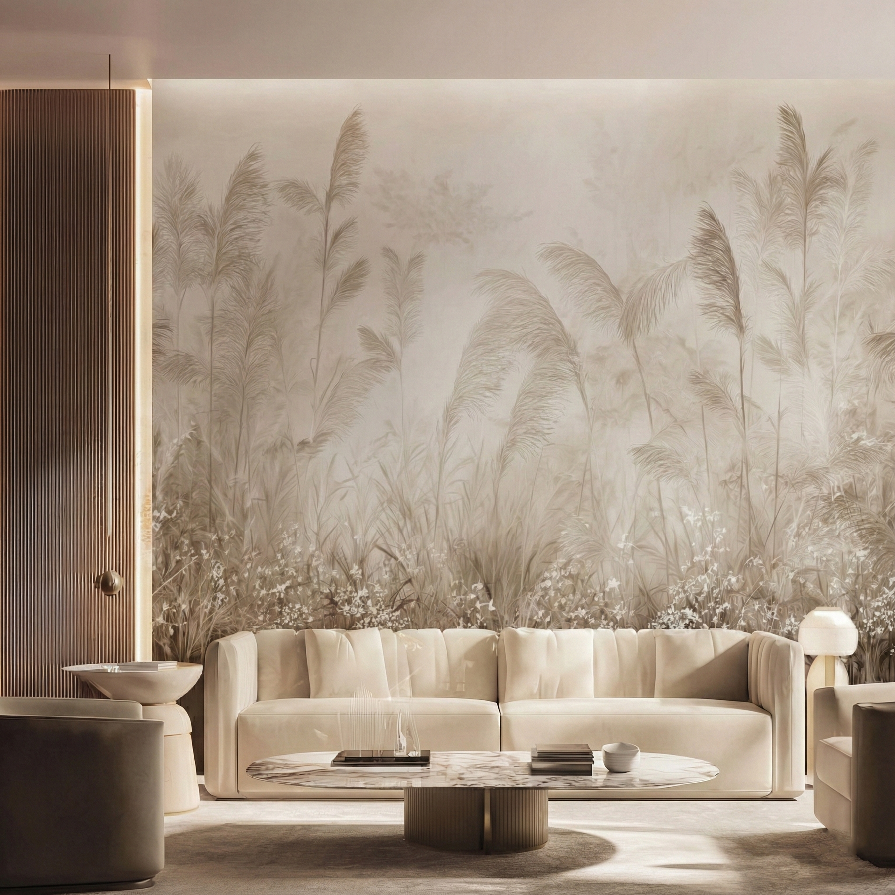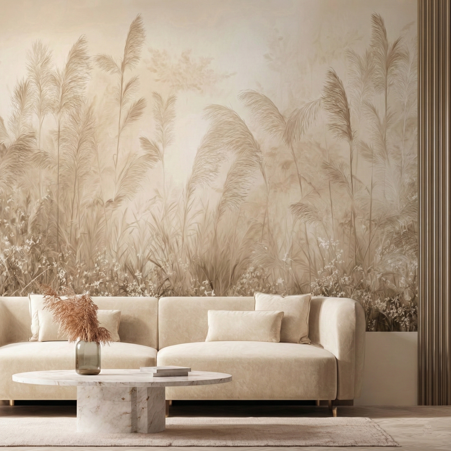 Wertykalny układ smukłych traw optycznie podwyższa pomieszczenie, dodając mu przestronności. Ciepłe, piaskowe tony wprowadzają do wnętrza słoneczny blask, nawet w pochmurne dni. To wzór, który doskonale koresponduje ze stylem skandynawskim oraz estetyką "wabi-sabi", tworząc tło sprzyjające relaksowi i wyciszeniu.