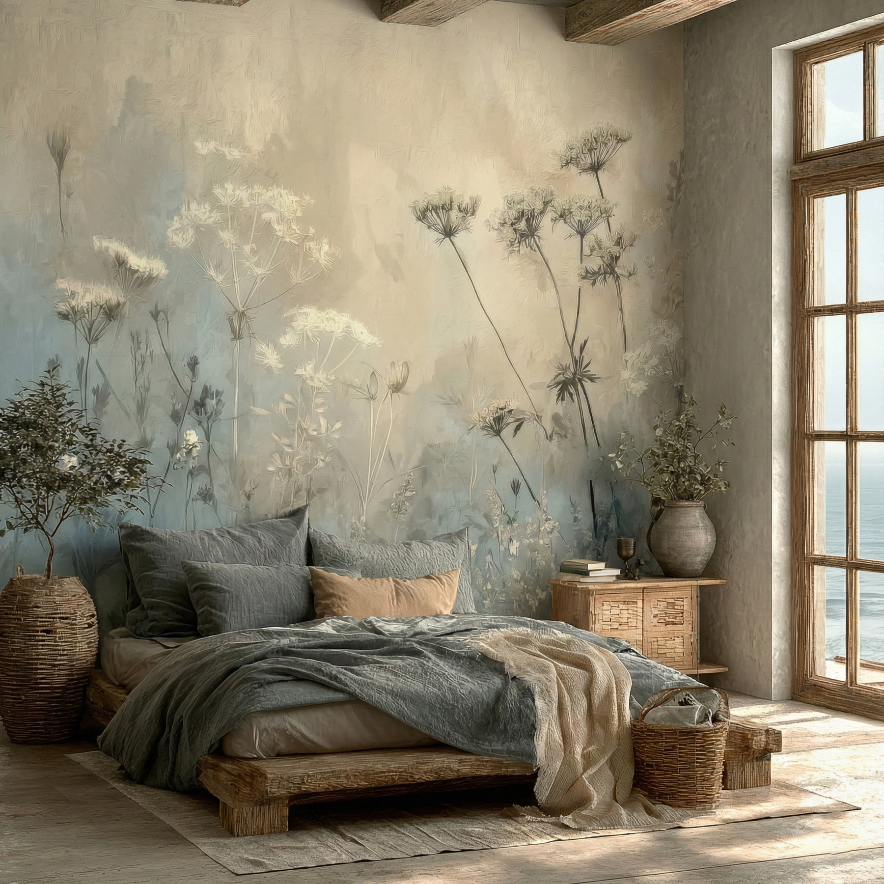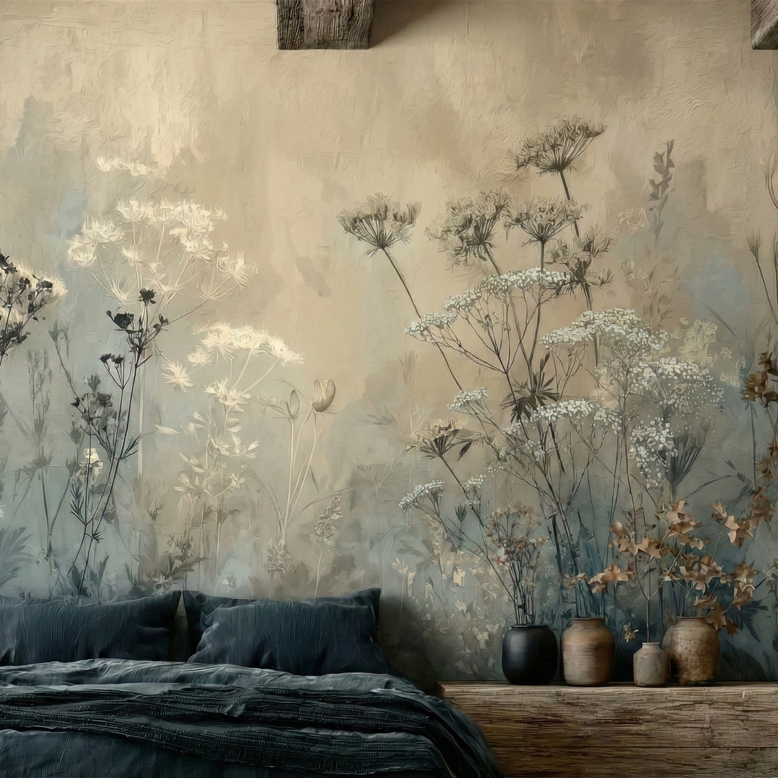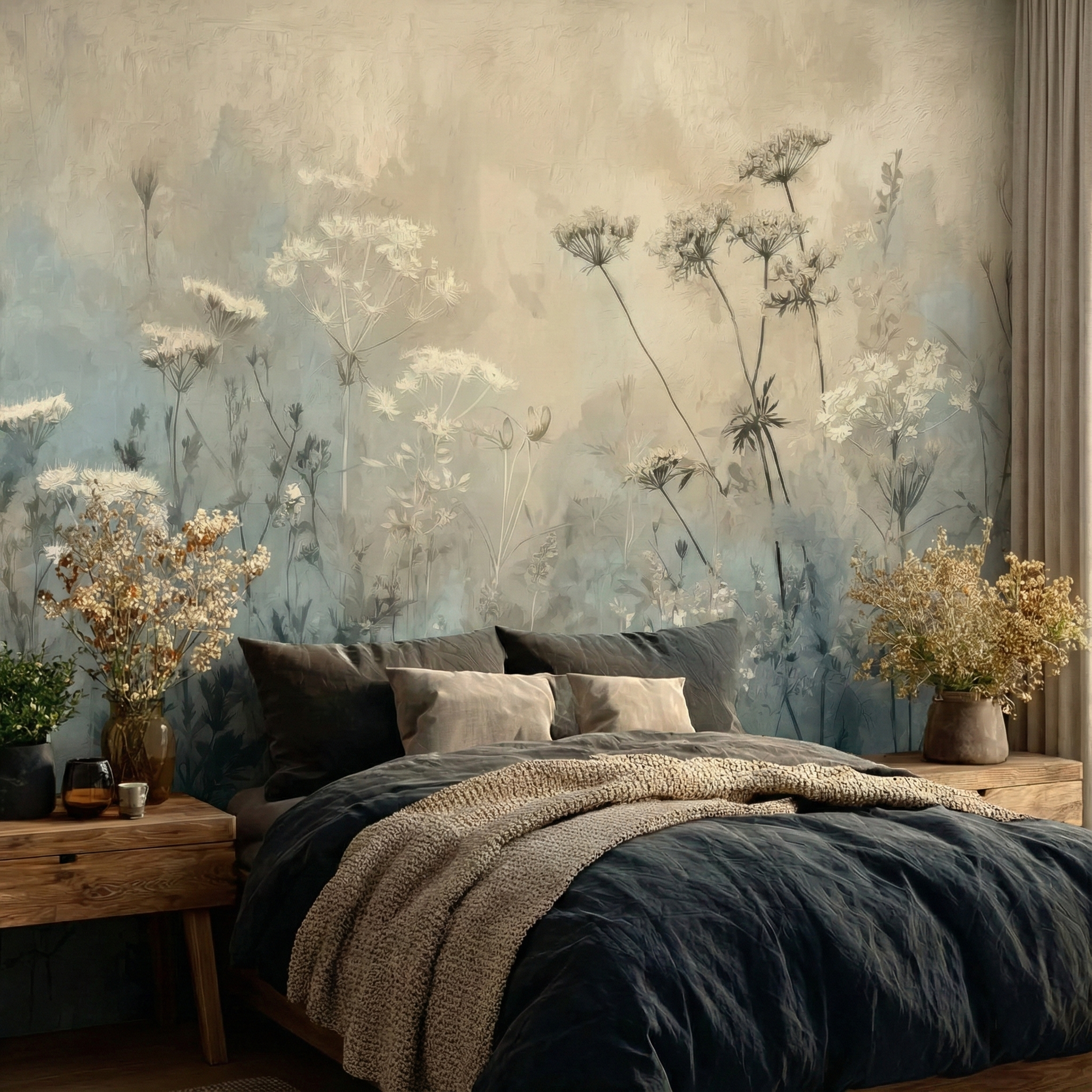 Szukasz idealnej dekoracji ściennej w stylu boho? Tapeta "Mglista Łąka" to wysokiej jakości fototapeta winylowa, przedstawiająca dzikie rośliny i polne kwiaty. Utrzymana w modnej kolorystyce szałwii, beżu i zgaszonego błękitu, stanowi doskonałe tło do sypialni, salonu lub rustykalnej kuchni.